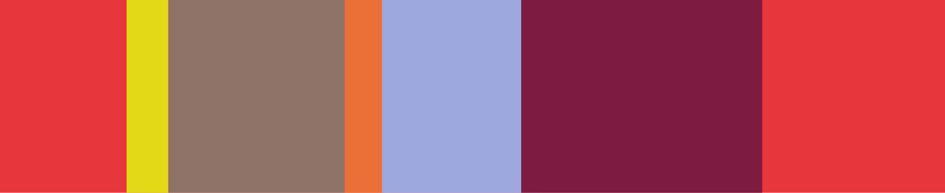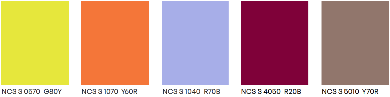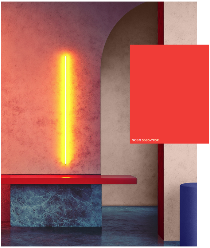 A cor chave, S 0580-Y90R, é um vermelho marcante e intensamente cromático que chama a atenção. Encontra o seu equilíbrio combinado com os tons borgonha e violeta profundos, laranja vivo e um toque de amarelo-esverdeado néon para espaços dinâmicos e cheios de energia.