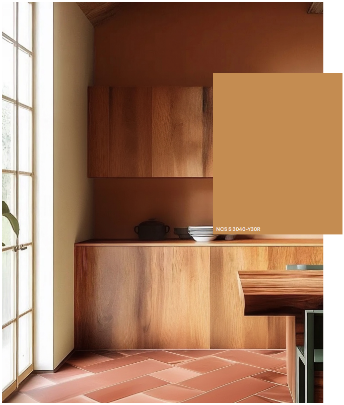 No coração desta paleta temos a cor S 3040-Y30R, um castanho couro quente que evoca a riqueza dos materiais naturais como a madeira, o barro e o couro envelhecido. Combina com os tons vermelho-oxidado, terracota-alaranjado e verdes-amarelados que reforçam a sensação de conforto e luxo orgânico do ambiente.