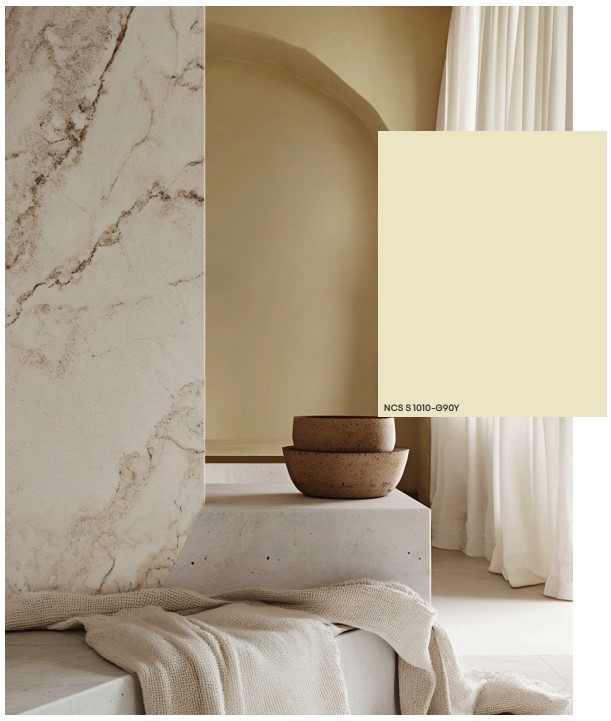 A cor principal, S 1010-G90Y, é um branco calcário que apresenta um ligeiro sub-tom amarelo-esverdeado que se altera em função da luz – subtilmente fresco à luz do dia e deliciosamente aconchegante sob iluminação artificial. A paleta é enriquecida por tons brancos rosados, neutros naturais, um bege luminoso e um cinzento-azulado claro complementar, reforçando uma ligação com a natureza em toda a simplicidade.