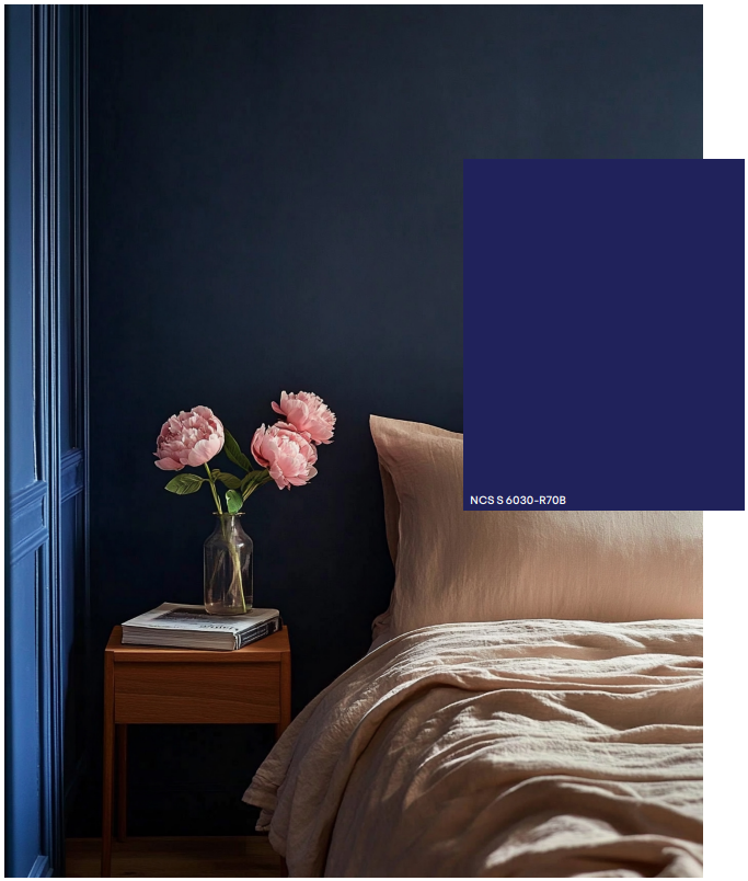A cor S 6030-R70B é a força gravitacional desta paleta – um azul-escuro enigmático com um toque de vermelho que desperta a curiosidade e apela à exploração. Os tons complementares incluem um bege dourado quente, azuis alilasados neutros e cremes delicados, criando uma ligação dinâmica de contrastes e luz.